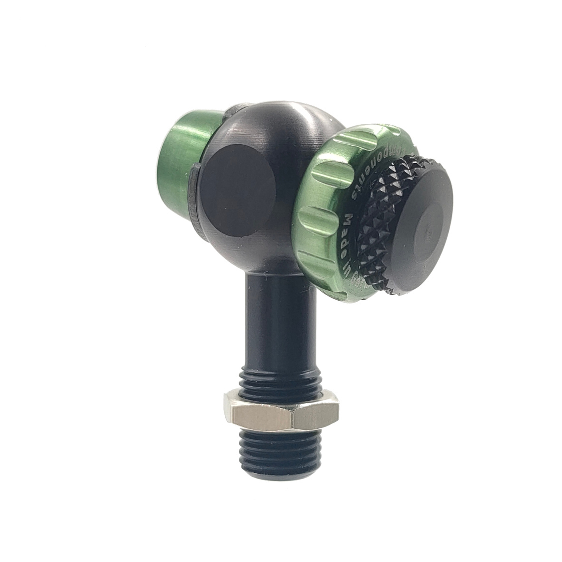 RESET エアポートアダプター EVO アルミ(新タイプ・グリーン) #3513-GR価格:7,700円(税込) リセット・エアポートアダプターEVO アルミ(新タイプ・グリーン) Reset Racing 定番のポンプヘッド。 バルブ開閉ダイヤルがグロメットになった新バージョン。 EVOは狭い箇所でもバルブを扱いやすい90度のタイプ。総アルミ製でカラーも鮮やか。 用途:エアサスポンプと組み合わせて使用します。エア調整後にエア漏れ無しでバルブを閉じることができるので正確なエア圧調整ができます。 最大耐圧力:30bar(440psi)
